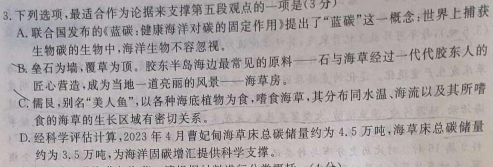3.下列选项,最适合作为论据来支撑第五段观点的一项是(3分)A.联合国发布的《蓝碳:健康海洋对碳的固定作用》提出了“蓝碳”这一概念:世界上捕获生物碳的生物中,海洋生物不容忽视。B.垒石为墙,覆草为顶。胶东半岛海边最常见的原料——石与海草经过一代代胶东人的匠心营造,成为当地一道亮丽的风景—海草房。C.儒艮,别名“美人鱼”,以各种海底植物为食,嗜食海草,其分布同水温、海流以及其所嗜食的海草的生长区域有密切关系。D.经科学评估计算,2023年4月曹妃甸海草床总碳储量约为4.5万吨,海草床总碳储量约为3.5万吨,为海洋固碳增汇提供科学支撑。