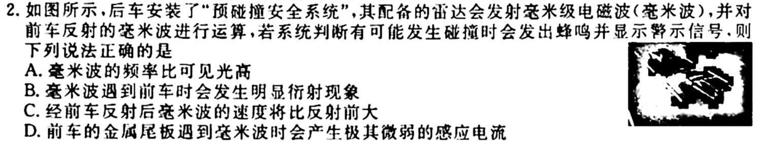 2..如图所示,后车安装了“预碰撞安全系统”,其配备的雷达会发射毫米级电磁波(毫米波),并对前车反射的毫米波进行运算,若系统判断有可能发生碰撞时会发出蜂鸣并显示警示信号,则下列说法正确的是A.毫米波的频率比可见光高B.毫米波遇到前车时会发生明显衍射现象C.经前车反射后毫米波的速度将比反射前大D.前车的金属尾板泗到毫米波时会产生极其微弱的感应电流