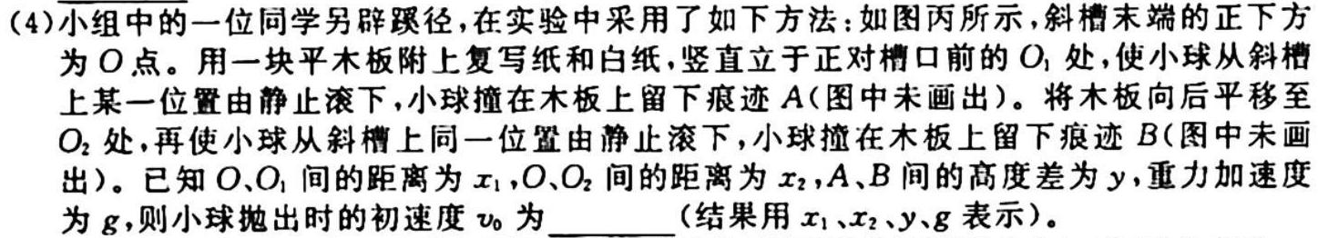 (4)小组中的一位同学另辟蹊径,在实验中采用了如下方法:如图丙所示,斜槽末端的正下方为O点。用一块平木板附上复写纸和白纸,竖直立于正对槽口前的O1处,使小球从斜槽上某一位置由静止滚下,小球撞在木板上留下痕迹A(图中未画出)。将木板向后平移至O2处,再使小球从斜槽上同一位置由静止滚下,小球撞在木板上留下痕迹B(图中未画出)。已知O、O1间的距离为x1,O、O2间的距离为x2,A、B间的高度差为y,重力加速度为g,,则小球抛出时的初速度v0为(结果用x1、x2、y、g表示)。