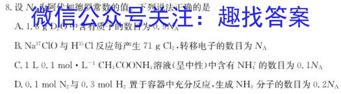 8.设NA为阿伏加德罗常数的值。下列说法正确的是A.1.8gD2O中含有质子的数目为0.9NAB.Na^37ClO与H^35Cl1反应每产生71gCl2,,转移电子的数目为NAC.1L0.1molL^-1CH3COONH4溶液(呈中性)中含有NH4^+的数目为0.1NAD.0.1molN2与0.3molH2置于容器中充分反应,生成NH3分子的数目为0.2NA