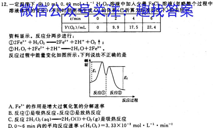 12.一定温度下,向10mL0.40molL^-1H2O2溶液中加入少量FeCl3溶液(忽略整个过程中溶液体积的变化),不同时刻测得生成O2的体积(已折算为标准状况下)如表所示:资料显示。反应分两步进行:12Fe^3++H2O22Fe^2++2H^++O22H2O2+2Fe^2++2H^+2H2O+2Fe^3+。反应过程中能量变化如图所示,下列说法不正确的是A.Fe^3+的作用是增大过氧化氢的分解速率B.反应①是吸热反应,反应②是放热反应C.反应2H2O2(aq)2H2O(l)+O2(g)是吸热反应D.06m内的平均反应速率v(H2O2)=3.3310^-2molL^-1^-分数班级姓名