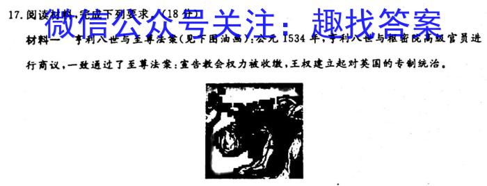17.阅读材料,完成下列要求。(18分)材料一亨利八世与至尊法案(见下图油画):公元1534年,亨利八世与枢密院高级官员进行商议,一致通过了至尊法案:宣告教会权力被收缴,王权建立起对英国的专制统治。同确定,一经确定,各国不论强弱大小,都必须服从国际法的约束,不得以国内法为借口违反国际法的规定;国际法的前提是国家主权,任何国家的主权不受别国的意志或法律的支配。格劳秀斯还拟定了国际法的一些具体条文,如:交战双方均不得杀害平民、儿童等非作战人员;也不准抢掠他们的财产;不准杀害、虐待停止抵抗的战俘;保护交战双方外交人员的人身安全及财产;等等。——摘编自[荷兰]格劳秀斯《战争与和平法》(1)用一句话概括材料一反映的实质,并以此为视角阐述17世纪国际法产生的时代背景。(8分)(2)根据材料二,概括格劳秀斯国际法主张体现的基本理念。并用一句话概括《战争与和平法》的历史地位。(10分)
