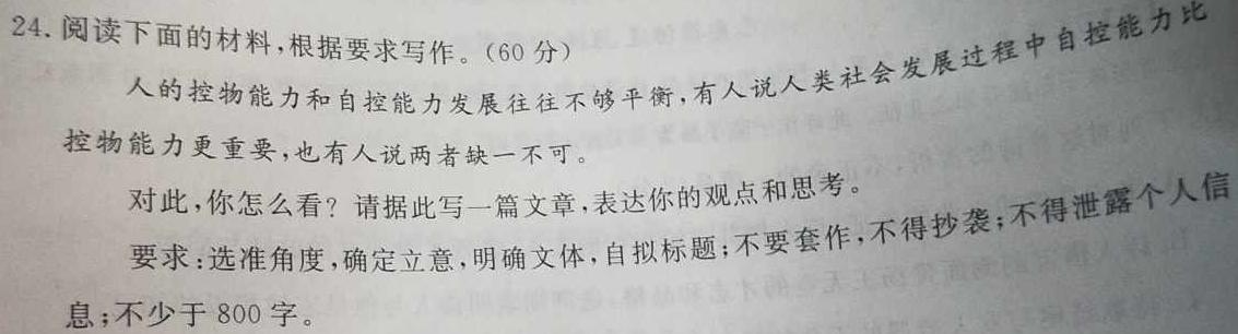 24.阅读下面的材料,根据要求写作。(60分)中自控能力比人的控人的控物能力和自控能力发展往往不够平衡,有人说人类社会发展过程中自控能力比人控物能力更重要,也有人说两者缺一不可。对此,你怎么看?请据此写一篇文章,表达你的观点和思考。要求:选准角度,确定立意,明确文体,自拟标题;不要套作,不得抄袭;不得泄露个人信露个人信息;不少于800字。