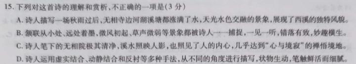 15.下列对这首诗的理解和赏析,不正确的一项是(3分)A.诗人描写一场秋雨过后,无相寺边河湖溪塘都涨满了水,天光水色交融的景象,展现了西溪的独特风貌。B.颔联从小处、远处着墨,微风初起、草声微弱等景象都被诗人一一捕捉,一见一听,错落有致,妙趣横生。C.诗人笔下的无相院极其清净,溪水照映人影,也照见了人的内心,几乎达到“心与境寂”的禅悟境地。D.诗人运用虚实结合、动静结合和反衬等多种手法,从不同的角度进行描写,状物生动,笔触鲜活而细腻。