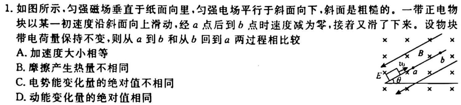 1.如图所示,匀强磁场垂直于纸面向里,匀强电场平行于斜面向下,斜面是粗糙的。一带正电物块以某一初速度沿斜面向上滑动,经a点后到b点时速度减为零,接着又滑了下来。设物块带电荷量保持不变,则从a到b和从b回到a两过程相比较A.加速度大小相等B.摩擦产生热量不相同C.电势能变化量的绝对值不相同D.动能变化量的绝对值相同