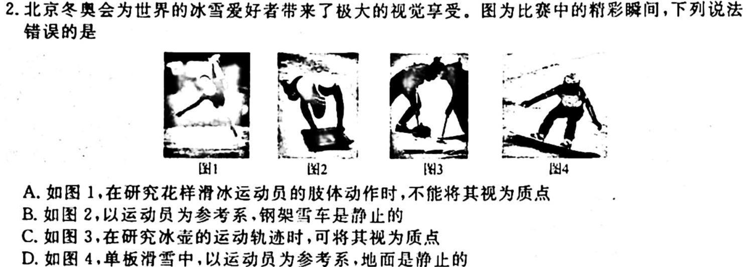 2.北京冬奥会为世界的冰雪爱好者带来了极大的视觉享受。图为比赛中的精彩瞬间,下列说法错误的是A.如图在研究花样滑冰运动员的肢体动作时,不能将其视为质点B.如图2,以运动员为参考系,钢架雪车是静止的C.如图3,在研究冰壶的运动轨迹时,可将其视为质点D.如图4,单板滑雪中,以运动员为参考系,地面是静止的