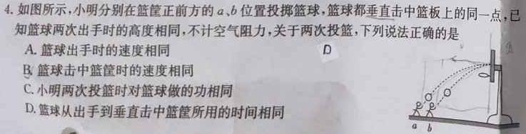 4.如图所示,小明分别在篮筐正前方的a、b位置投掷篮球,篮球都垂直击中篮板上的同一点,已知篮球两次出手时的高度相同,不计空气阻力,关于两次投篮,下列说法正确的是A.篮球出手时的速度相同B.篮球击中篮筐时的速度相同C.小明两次投篮时对篮球做的功相同D.篮球从出手到垂直击中篮筐所用的时间相同D