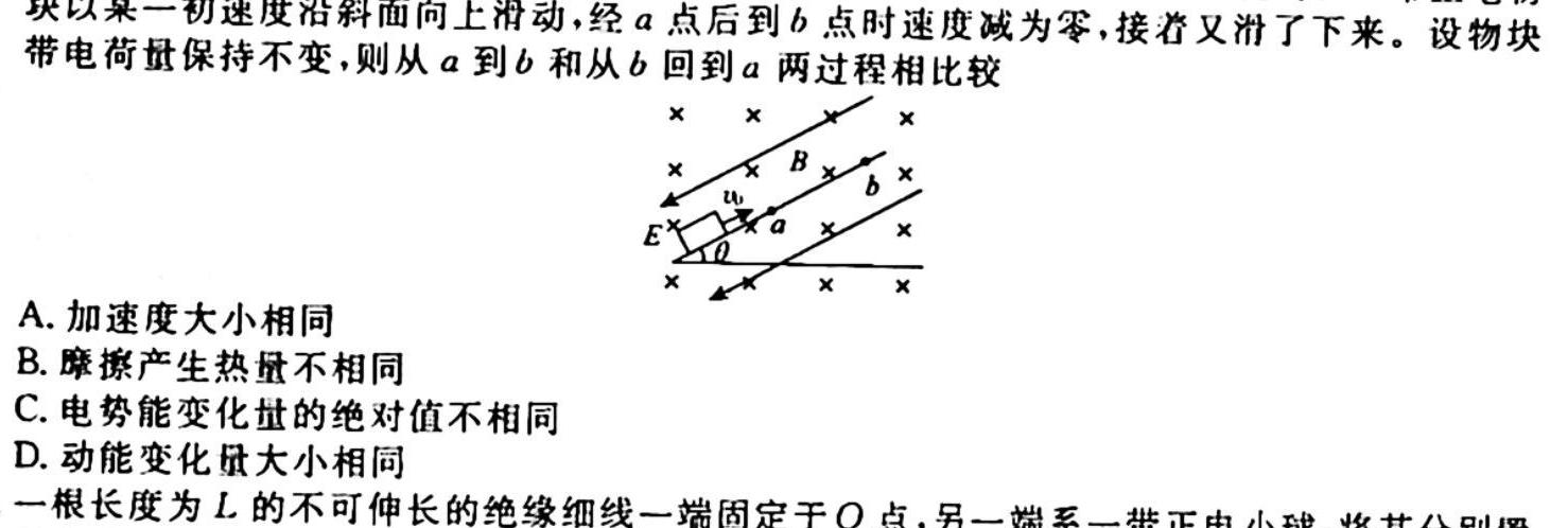 2.如图所示,匀强磁场垂直于纸面向里,匀强电场平行于斜面向下,斜面是粗糙的。一带正电物块以某一初速度沿斜面向上滑动,经a点后到b点时速度减为零,接着又滑了下来。设物块带电荷量保持不变,则从a到b和从b回到a两过程相比较A.加速度大小相同B.摩擦产生热量不相同C.电势能变化量的绝对值不相同D.动能变化量大小相同