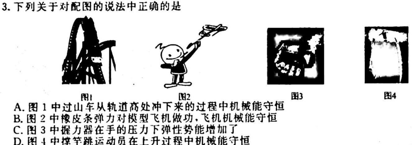 3.下列关于对配图的说法中正确的是A.图1中过山车从轨道高处冲下来的过程中机械能守恒B.图2中橡皮条弹力对模型飞机做功,飞机机械能守恒C.图3中握力器在手的压力下弹性势能增加了D.图4中撑竿跳运动员在上升过程中机械能守恒