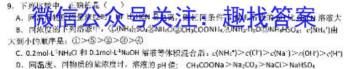 9.下列比较中,正确的是()A.同温同物质的量浓度时,HF比HCN易电离,则相同条件下NaF溶液的比NaCHB.问浓度的下列溶液中,Cl2H2H4l2SO42H2CO3(H3COONH4.)3NH3H2O2H2HSO4=C^1NH4大到小的顺序是:①>circled3>②>circled>>⑤C.0.2molLPH4Cl和D.1mclL^-1NiDOH熔液等体积混合后:cd(NH2^+)F^->c(Cl^-)=c(Na^-)>c(OH^+)c^2(H^+)D.同温度、同物质的量浓度时,溶液的CH3COONa>Na2CO3>NaCl>NaHSO4