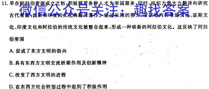11.早在阿拉伯帝国成立之初,积极网罗各种人才为帝国服务,同时,组织力量大力翻译和研究古代希腊、波斯和印度的文化典籍与著作。经过长期的努力,帝国境内的希腊文化、波斯文化、印度文化和阿拉伯的传统文化被整合起来,形成一种崭新的阿拉伯文化。这反映了阿拉伯帝国A.促成了东方文明的勃兴B.具有东西方文明交流桥梁作用及创新精神C.改变了西方文明的进程D.在东西方社会转型过程中起到了积极作用C.赋予了女性更多的政治权利D.促进了国民家庭生活的和谐