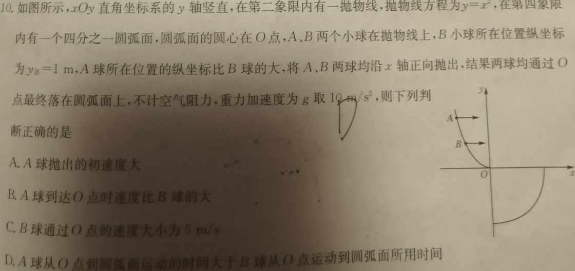 10.如图所示,xOy直角坐标系的y轴竖直,在第二象限内有一抛物线,抛物线方程为y=x^2,在第四象限内有一个四分之一圆弧面,圆弧面的圆心在O点,A、B两个小球在抛物线上,B小球所在位置纵坐标为yB=1m,A球所在位置的纵坐标比B球的大,将A、B两球均沿x轴正向抛出,结果两球均通过O点最终落在圆弧面上,不计空气阻力,重力加速度为g取/s^2,,则下列判断正确的是ABA.A球抛出的初速度大B.A球到达O点时速度比B球的大C.B球通过O点的速度大小为5m/sD.A球从O点到圆弧面运动的时间大于B球从O点运动到圆弧面所用时间