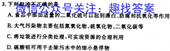 3.下列叙述不正确的是A.食品中添加适量的二氧化硫可以起到漂白、防腐和抗氧化等作用B.大气污染物主要包括氮氧化物、硫氧化物、二氧化碳等C.将垃圾进行分类处理,可实现资源的合理利用D.硫酸铝可用于去除污水中的细小悬浮物