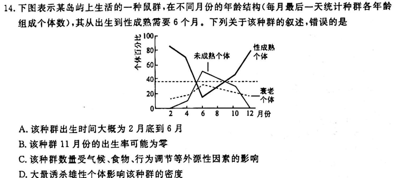 14.下图表示某岛屿上生活的一种鼠群,在不同月份的年龄结构(每月最后一天统计种群各年龄组成个体数),其从出生到性成熟需要6个月。下列关于该种群的叙述,错误的是A.该种群出生时间大概为2月底到6月B.该种群11月份的出生率可能为零C.该种群数量受气候、食物、行为调节等外源性因素的影响D.大量诱杀雄性个体影响该种群的密度