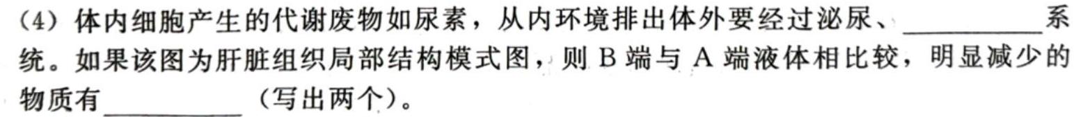 (4)体内细胞产生的代谢废物如尿素,从内环境排出体外要经过泌尿、系统。如果该图为肝脏组织局部结构模式图,则B端与A端液体相比较,明显减少的物质有(写出两个)。