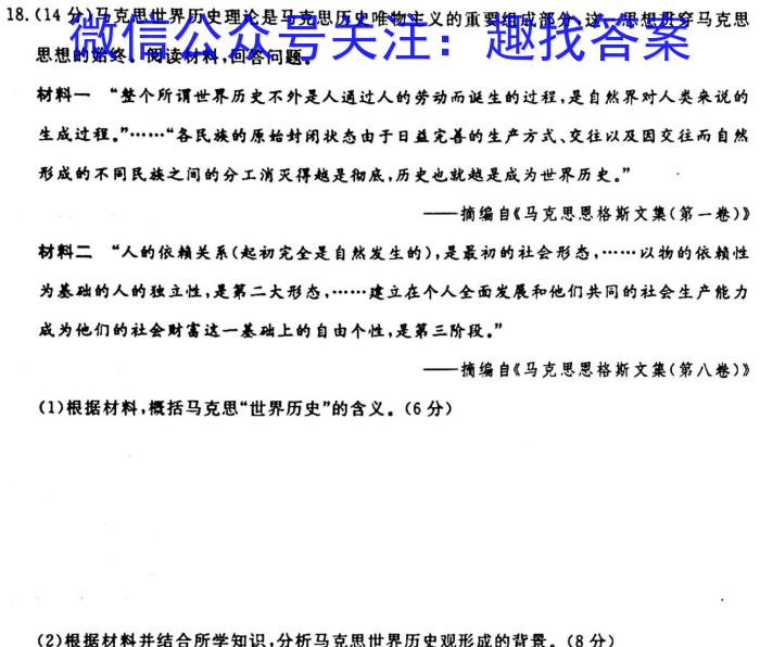 18.(14分)马克思世界历史理论是马克思历史唯物主义的重要组成部分,这一思想贯穿马克思思想的始终。阅读材料,回答问题。材料一“整个所谓世界历史不外是人通过人的劳动而诞生的过程,是自然界对人类来说的生成过程。”……“各民族的原始封闭状态由于日益完善的生产方式、交往以及因交往而自然形成的不同民族之间的分工消灭得越是彻底,历史也就越是成为世界历史。””——摘编自《马克思恩格斯文集(第一卷)材料二“人的依赖关系(起初完全是自然发生的),是最初的社会形态,……以物的依赖性为基础的人的独立性,是第二大形态,……建立在个人全面发展和他们共同的社会生产能力成为他们的社会财富这一基础上的自个性,是第三阶段。”——摘编自《马克思思格斯文集(第八卷)(1)根据材料,概括马克思“世界历史”的含义。(6分)(2)根据材料并结合所学知识,分析马克思世界历史观形成的背景。(8分)