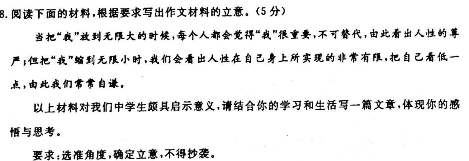 8.阅读下面的材料,根据要求写出作文材料的立意。(5分)当把“我”放到无限大的时候,每个人都会觉得“我”很重要,不可替代,由此看出人性的算严;但把“我”缩到无限小时,我们会看出人性在自己身上所实现的非常有限,把自己看低一点,由此我们常常自谦,以上材料对我们中学生颇具启示意义,请结合你的学习和生活写一篇文章,体现你的感悟与思考。要求:选准角度,确定立意,不得抄袭。