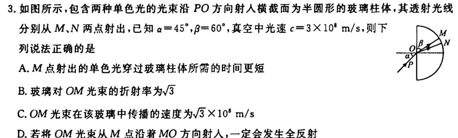 3.如图所示,包含两种单色光的光束沿PO方向射人横截面为半圆形的玻璃柱体,其透射光线分别从M、N两点射出,已知=45^,=60^,,真空中光速c=310^8m/s,,则下列说法正确的是A.M点射出的单色光穿过玻璃柱体所需的时间更短B.玻璃对OM光束的折射率为3C.OM光束在该玻璃中传播的速度为310^8m/sD.若将OM光束从M点沿着MO方向射人,一定会发生全反射