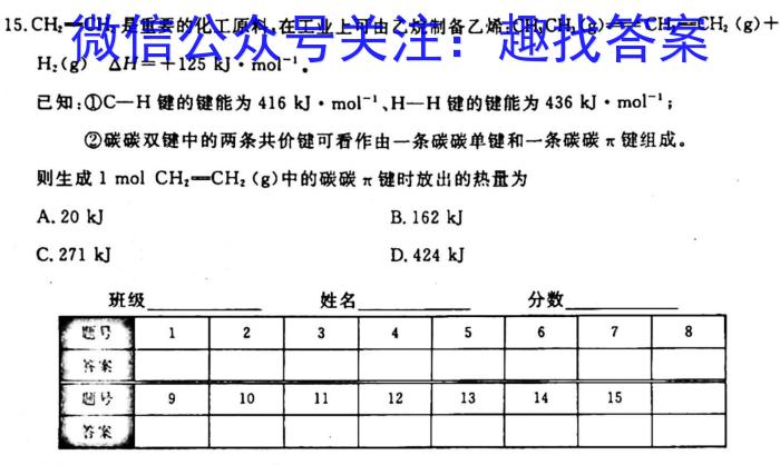15.CH2CH2是重要的化工原料,在工业上可由乙烷制备乙烯:CH3CH3(g)CH2CH2(g)+H2(g)H=+125kJmol^-1。已知:①C-H键的键能为416kJmol^-1、H-H键的键能为436kJmol^-1;②碳碳双键中的两条共价键可看作由一条碳碳单键和一条碳碳π键组成。则生成中的碳碳1molCH2CH2(g)π键时放出的热量为A.20kB.162kJC.271kJD.424kJ