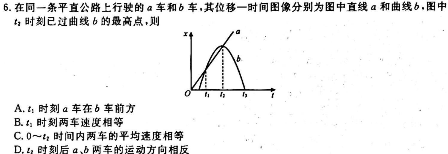 6.在同一条平直公路上行驶的a车和b车,其位移一时间图像分别为图中直线a和曲线b,图中t2时刻已过曲线b的最高点,则A.t1时刻a车在b车前方B.t1时刻两车速度相等C.0t2时间内两车的平均速度相等D.t2时刻后a、b两车的运动方向相反