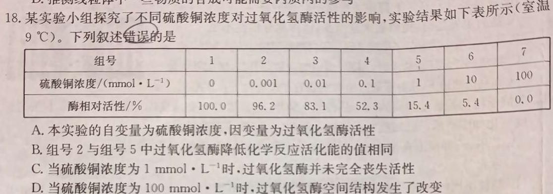 18.某实验小组探究了不同硫酸铜浓度对过氧化氢酶活性的影响,实验结果如下表所示(室温9^C)。,下列叙述错误的是A.本实验的自变量为硫酸铜浓度,因变量为过氧化氢酶活性B.组号2与组号5中过氧化氢酶降低化学反应活化能的值相同C.当硫酸铜浓度为1mmolL^-时,过氧化氢酶并未完全丧失活性D.当硫酸铜浓度为100mmol⋅L时,过氧化氢酶空间结构发生了改变