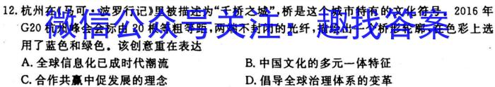 12.杭州在《马可·波罗行记》里被描述为“千桥之城”,桥是这个城市特有的文化符号。2016年G20杭州峰会会标由20根等粗等距,两端不封闭的光纤,描绘出一个桥形轮廓,在色彩上选用了蓝色和绿色。该创意重在表达A.全球信息化已成时代潮流B.中国文化的多元一体特征C.合作共赢中促发展的理念D.倡导全球治理体系的变革
