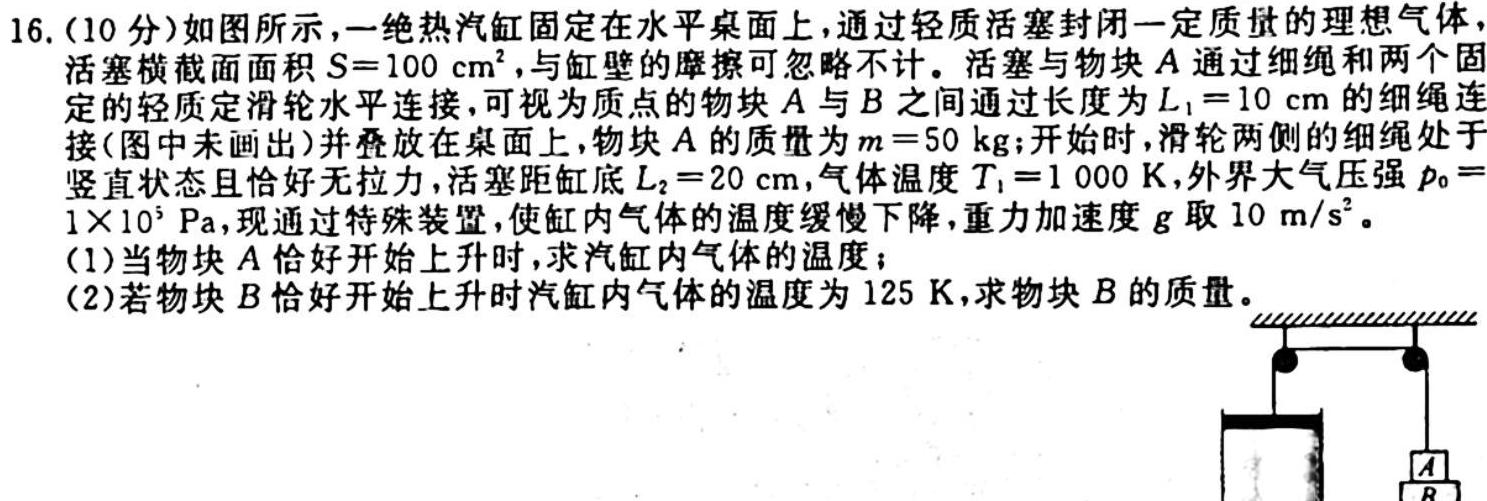 16.(10分)如图所示,一绝热汽缸固定在水平桌面上,通过轻质活塞封闭一定质量的理想气体,活塞横截面面积S=100cm^2,与缸壁的摩擦可忽略不计。活塞与物块A通过细绳和两个固定的轻质定滑轮水平连接,可视为质点的物块A与B之间通过长度为L1=10cm的细绳连接(图中未画出)并叠放在桌面上,物块A的质量为m=50kg;开始时,滑轮两侧的细绳处于竖直状态且恰好无拉力,活塞距缸底L2=20cm,气体温度T1=1000K,外界大气压强p0=110^5Pa,现通过特殊装置,使缸内气体的温度缓慢下降,重力加速度g取10m/s^2。(1)当物块A恰好开始上升时,求汽缸内气体的温度;;(2)若物块B恰好开始上升时汽缸内气体的温度为125K,求物块B的质量。