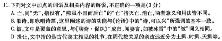 11.下列对文中加点的词语及相关内容的解说,不正确的一项是(3分)A.亡,同“无”,指没有,“燕虽小国而后亡”的“亡”指灭亡、消亡,两者意义和用法皆不同。B.歌诗,即咏唱诗篇,这里阐述的诗的功能与《论语》中的“诗,可以兴”所强调的基本一致。C.被,文中是覆盖的意思,与《聊斋·促织》“成归,闻妻言,如被冰雪”中的“被”词义相同。D.揖让,文中指的是古代宾主相见的礼节,在周代按关系的亲疏远近分为土揖、时揖、天揖等。