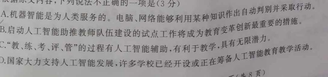 2.根据原文内容,下列说法不正确的一项是(3分)A.机器智能是为人类服务的。电脑、网络能够利用某种知识作出自动判别并采取行动。施。B.启动人工智能助推教师队伍建设的试点工作将成为教育变革创新最重要的措施。力C.“教、练、考、评、管”的过程有人工智能辅助,有利于教学,具有无限潜力。教学活动。D.国家大力支持人工智能发展,许多学校已经开设或正在筹备人工智能教育教学活动。