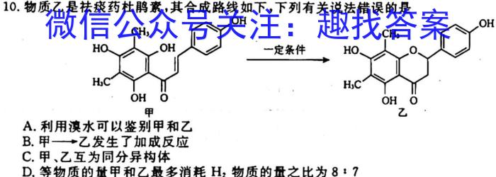 10.物质乙是祛痰药杜鹃素,其合成路线如下,下列有关说法错误的是A.利用溴水可以鉴别甲和乙B.甲一→乙发生了加成反应C.甲、乙互为同分异构体D.等物质的量甲和乙最多消耗H2物质的量之比为8:7