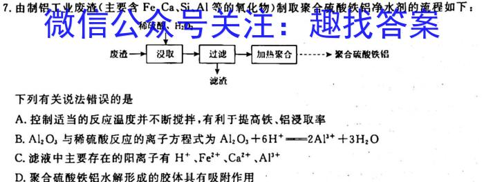 7.由制铝工业废渣(主要含Fe、Ca、Si、A1等的氧化物)制取聚合硫酸铁铝净水剂的流程如下:稀硫酸、聚合硫酸铁铝下列有关说法错误的是A.控制适当的反应温度并不断搅拌,有利于提高铁、铝浸取率B.Al2O3与稀硫酸反应的离子方程式为Al2O3+6H^+2Al^3++3H2OC.滤液中主要存在的阳离子有H^+、Fe^2+、Ca^2+、Al^3+D.聚合硫酸铁铝水解形成的胶体具有吸附作用