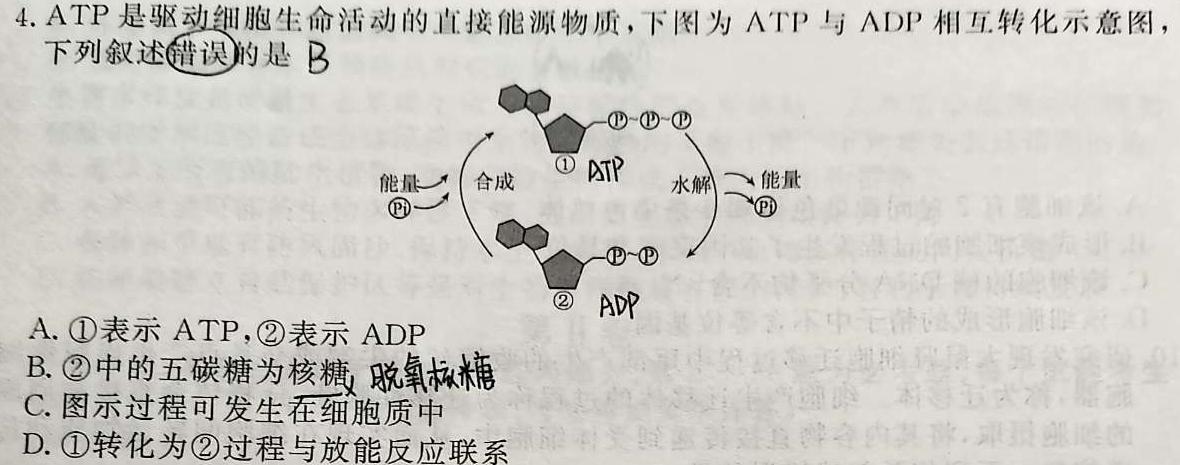 4.ATP是驱动细胞生命活动的直接能源物质,下图为ATP与ADP相互转化示意图,下列叙述错误的是BA.①表示ATP,②表示ADPB.②中的五碳糖为核糖脱氧核糖C.图示过程可发生在细胞质中D.①转化为②过程与放能反应联系