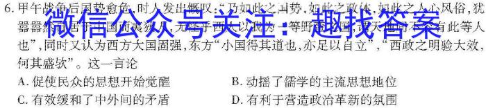 6.甲午战争后国势愈危,时人发出慨叹:“乃如此之国势,如此之政体,如此之人心风俗,犹嚣嚣然自居于中国而夷狄人,无怪乎西人以我为三等野蛮之国,谓天地间不容有此等人也”,同时又认为西方大国固强,东方“小国得其道也,亦足以自立”,“西政之明验大效,何其盛软”。这一言论A.促使民众的思想幵始觉醒B.动摇了儒学的主流思想地位C.有效缓和了中外间的矛盾D.有利于营造政治革新的氛围