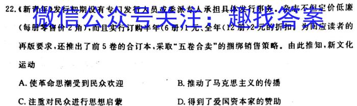 22.《新青年》发行初期设有专门发行人员或委派专人承担具体发行事务。杂志不但定价低廉(每册零售价2角),而且实行订购半年(6册)1元、全年(12册)2元的折扣。为回应读者的再版要求,还推出了前5卷的合订本,采取“五卷合卖”的拥绑销售策略。由此推知,A.使革命思潮受到民众欢迎B.推动了的传播C.注重对民众进行思想启蒙D.得到了爱国资本家的赞助