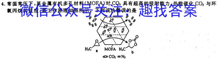 4.常温常压下,某金属有机多孔材料(MOFA)对CO2具有超高的吸附能力,并能催化CO2,与环氧丙烷的反应,其工作原理如图所示。下列说法错误的是A.a分子中碳原子和氧原子均采取sp^3杂化B.a的一氯代物有3种C.a生成b的反应类型为取代反应,并有极性共价键的断裂与形成D.环氧丙烷属于醚类有机物,与环氧乙烷互为同系物