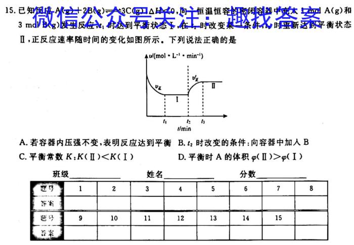 15.已知反应A(g)+2B(g)3C(g),H<0,,向一恒温恒容的密闭容器中充人1molA(g))和3molB(g)发生反应,l1时达到平衡状态I,在l2时改变某一条件,t3时重新达到平衡状态Ⅱ,正反应速率随时间的变化如图所示。下列说法正确的是A.若容器内压强不变,表明反应达到平衡B.t2时改变的条件:向容器中加入BC.平衡常数K:K(I)φ(I)