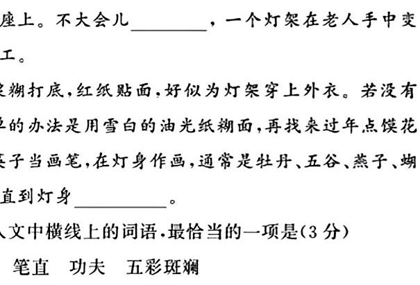 糊打底,红纸贴面,好似为灯架穿上外衣。若没有的办法是用雪白的油光纸糊面,再找来过年点馍花子当画笔,在灯身作画,通常是牡丹、五谷、燕子、蝴直到灯身。文中横线上的词语,最恰当的一项是(3分)洗一个澡,看一朵花,吃一顿饭,②,并非全因为澡洗得干净,花开得好,或者菜合你的口味,主要是因为你心上没有挂碍,轻松的灵魂可以专注肉体的感觉。要是你精神上不痛快,比如参加离别的宴席,随它怎样烹调得好,③。那时刻的灵魂,仿佛害病的眼怕见阳光,虽然阳光是明媚的;,