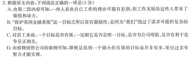 2.根据原文内容,下列说法正确的一项是(3分)A.由第二段内容可知,一些人喜欢自己工作的理由可能有差别,但工作无疑给这些人带来了愉悦和动力。B.“保护英国金融系统”这一目标之所以富有激励性,是因为“我们”绕过了诸多可能但复杂的目标。C.对员工来说,一个目标是否有效,一定跟它是否是唯一目标、是否为公司增值、是否有利于竞争呈正相关。D.由植物销售公司的案例可知,即便是找到一个微小但有效的目标也并非易事,要经过多年努力才能实现。