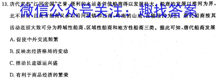 13.唐代素有“江河帝国”之誉,便利的水运条件使船商得以发展壮大。船商的发展以淮河为界,北不如南,且南方船商又多以沿河城镇和江南、岭南的山地、丘陵居民为主。唐代船商按其活动范围大致可分为跨域性船商、区域性船商和地方性船商三类。据此可知,唐代船商发展A.促使中外交流频繁B.反映出经济格局的变动C.推动长途贩运兴盛D.有利于商品经济的繁荣