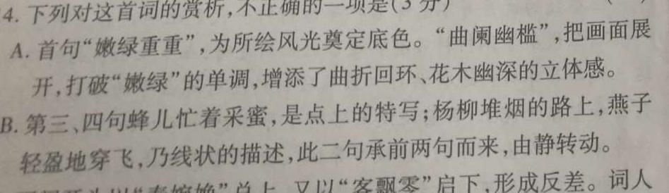 14.下列对这首词的赏析,不正确的一项是(3分)()(1)苏轼的《念奴娇·赤壁怀古》气魄宏伟,视野阔大,全词既有对对壮丽山河的赞美,更有对英雄人物的追慕。对于自己的功业无成,作者不禁心生惆怅,最后发出了“,”的感慨。