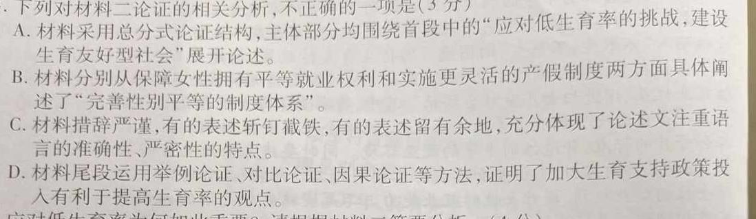 3.下列对材料二论证的相关分析,不正确的一项是(3分)A.材料采用总分式论证结构,主体部分均围绕首段中的“应对低生育率的挑战,建设生育友好型社会”展开论述。B.材料分别从保障女性拥有平等就业权利和实施更灵活的产假制度两方面具体阐述了“完善性别平等的制度体系”。C.材料措辞严谨,有的表述斩钉截铁,有的表述留有余地,充分体现了论述文注重语言的准确性、严密性的特点。D.材料尾段运用举例论证、对比论证、因果论证等方法,证明了加大生育支持政策投入有利于提高生育率的观点。