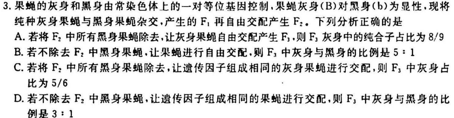 3.果蝇的灰身和黑身由常染色体上的一对等位基因控制,果蝇灰身(B)对黑身(b)为显性,现将F1再自由交配产生F2。,下列分析正确的是纯种灰身果蝇与黑身果蝇杂交,产生的A.若将F2中所有黑身果蝇除去,让灰身果蝇自由交配产生F3,,则F3灰身中的纯合子占比为8/9B.若不除去F2中黑身果蝇,让果蝇进行自由交配,则F3中灰身与黑身的比例是5:1C.若将F2中所有黑身果蝇除去,让遗传因子组成相同的灰身果蝇进行交配,则F3中灰身占比为5/6D.若不除去F2中黑身果蝇,让遗传因子组成相同的果蝇进行交配,则F3中灰身与黑身的比例是3:1