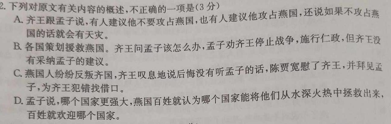 12.下列对原文有关内容的概述,不正确的一项是(3分)A.齐王跟孟子说,有人建议他不要攻占燕国,也有人建议他攻占燕国,还说如果不攻占燕国的话就会有天灾。B.各国策划援救燕国。齐王问孟子该怎么办,孟子劝齐王停止战争,施行仁政,但齐王没有采纳孟子的建议。C.燕国人纷纷反叛齐国,齐王叹息地说后悔没有听孟子的话,陈贾宽慰了齐王,并拜见孟子,为齐王犯错找借口。D.孟子说,哪个国家更强大,燕国百姓就认为哪个国家能将他们从水深火热中拯救出来,百姓就欢迎哪个国家。