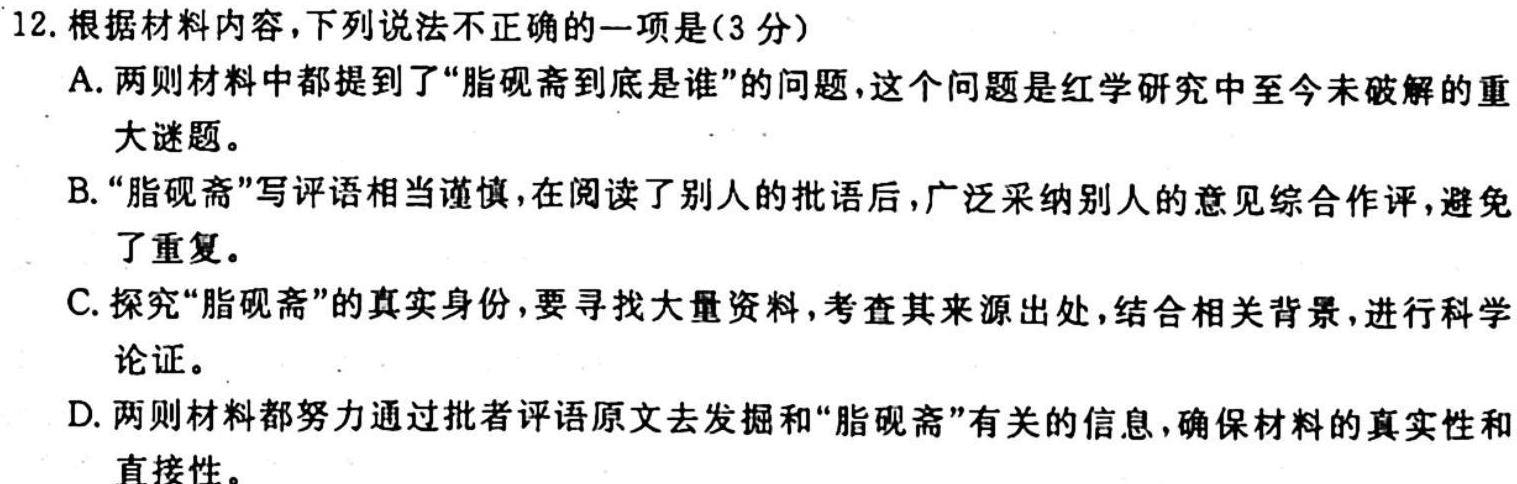 12.根据材料内容,下列说法不正确的一项是(3分)A.两则材料中都提到了“脂砚斋到底是谁”的问题,这个问题是红学研究中至今未破解的重大谜题。B.“脂砚斋”写评语相当谨慎,在阅读了别人的批语后,广泛采纳别人的意见综合作评,避免了重复。C.探究“脂砚斋”的真实身份,要寻找大量资料,考查其来源出处,结合相关背景,进行科学论证。D.两则材料都努力通过批者评语原文去发掘和“脂砚斋”有关的信息,确保材料的真实性和直接性。