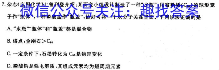 7.杂志《应用化学》上曾刊登介绍:某研究小组设计制造了一种“水瓶”,用富勒烯(C60)的球形笼子作“瓶体”,一种磷酸盐作“瓶盖”,恰好可将一个水分子关在里面。下列说法正确的是A.“水瓶”“瓶体”和“瓶盖”都是混合物B.熔点:金刚石>C60C.一定条件下,石墨转化为C60是物理变化D.磷酸钙是强电解质,其组成元素均为短周期元素