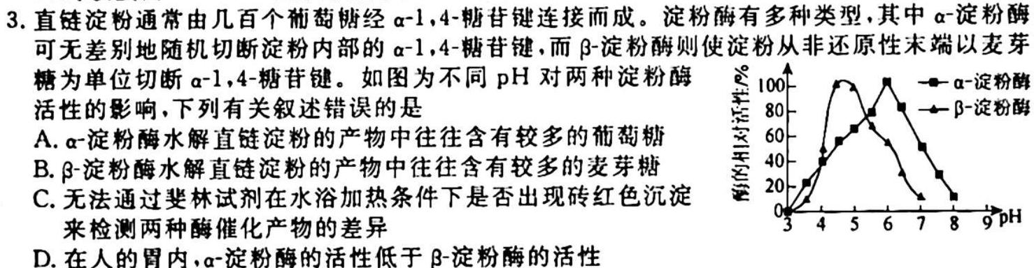 3.直链淀粉通常由几百个葡萄糖经α-1,4-糖苷键连接而成。淀粉酶有多种类型,其中^-淀粉酶可无差别地随机切断淀粉内部的α-1,4-糖苷键,而-淀粉酶则使淀粉从非还原性末端以麦芽糖为单位切断α-1,4-糖苷键。如图为不同pH对两种淀粉酶活性的影响,下列有关叙述错误的是A.^-淀粉酶水解直链淀粉的产物中往往含有较多的葡萄糖B.3-淀粉酶水解直链淀粉的产物中往往含有较多的麦芽糖C.无法通过斐林试剂在水浴加热条件下是否出现砖红色沉淀来来检测两种酶催化产物的差异D.在人的胃内,a^-淀粉酶的活性低于β-淀粉酶的活性
