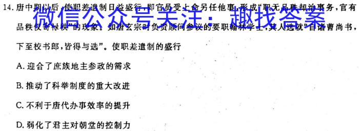 14.唐中期以后,使职差制日益盛行,即官员受上命另任他事,形成“职无品秩却治事务,官有品秩仅寄禄秩”的现象。如唐玄宗时负责顾问参议的要职翰林学士,其人选就“自诸曹尚书,下至校书郎,皆得与选”。使职差遣制的盛行A.迎合了庶族地主参政的需求B.推动了科举制度的重大改进C.不利于唐代办事效率的提升D.弱化了君主对朝堂的控制力