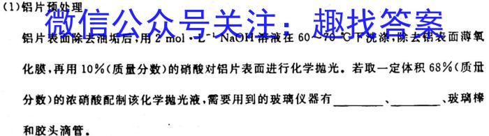 (1)铝片预处理铝片表面除去油垢后,用2molL^-1NaOH溶液在6070^C下洗涤,除去铝表面薄氧化膜,再用10%(质量分数)的硝酸对铝片表面进行化学抛光。若取一定体积68%(质量分数)的浓硝酸配制该化学抛光液,需要用到的玻璃仪器有、、玻璃棒和胶头滴管。