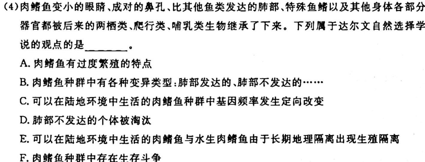 (4)肉鳍鱼变小的眼睛、成对的鼻孔、比其他鱼类发达的肺部、特殊鱼鳍以及其他身体各部分器官都被后来的两栖类、爬行类、哺乳类生物继承了下来。下列属于达尔文自然选择学说的观点的是。A.肉鳍鱼有过度繁殖的特点B.肉鳍鱼种群中有各种变异类型:肺部发达的、肺部不发达的……C.可以在陆地环境中生活的肉鳍鱼种群中基因频率发生定向改变D.肺部不发达的个体被淘汰E.可以在陆地环境中生活的肉鳍鱼与水生肉鳍鱼由于长期地理隔离出现生殖隔离F.肉鳍鱼种群中存在生存斗争