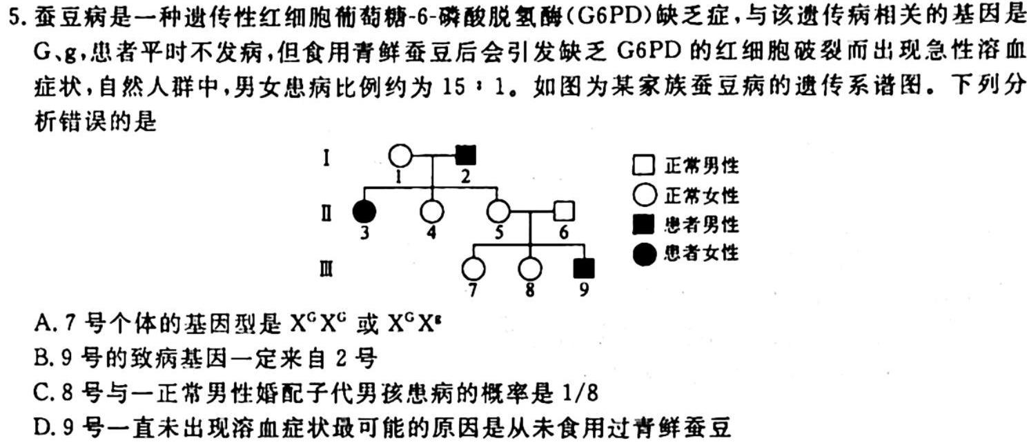 5.蚕豆病是一种遗传性红细胞葡萄糖-6-磷酸脱氢酶(G6PD)缺乏症,与该遗传病相关的基因是G、g,患者平时不发病,但食用青鲜蚕豆后会引发缺乏G6PD的红细胞破裂而出现急性溶血症状,自然人群中,男女患病比例约为15:1。,如图为某家族蚕豆病的遗传系谱图。下列分析错误的是A.7号个体的基因型是X^cX^c或X^cX^sB.9号的致病基因一定来自2号C.8号与一正常男性婚配子代男孩患病的概率是1/8D.9号一直未出现溶血症状最可能的原因是从未食用过青鲜蚕豆